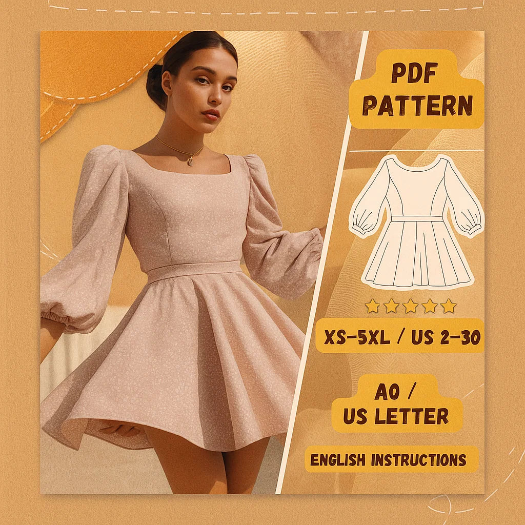 Bishop Sleeve Mini Dress PDF Sewing Pattern – Flared Circle Dress