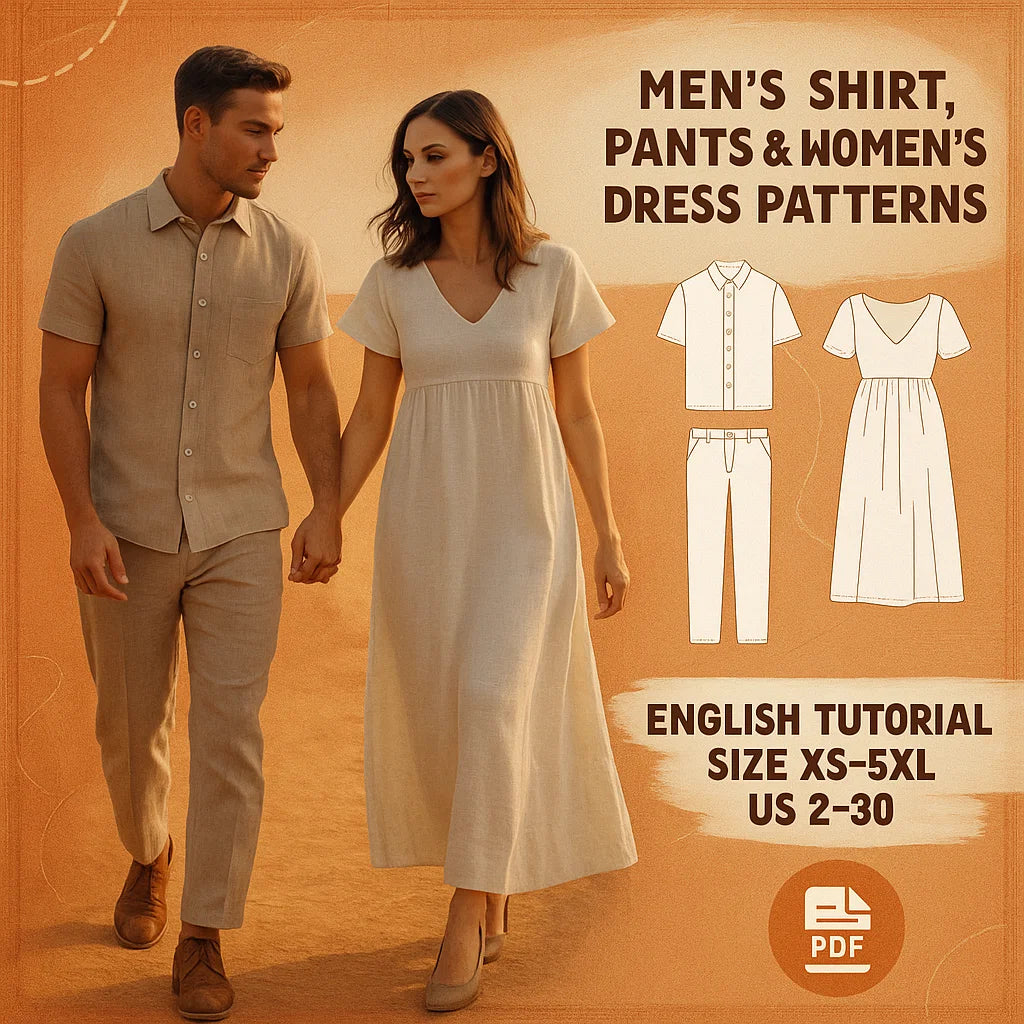 Create timeless, breathable outfits with this Linen Set Sewing Pattern Bundle, featuring a relaxed men’s shirt and pants, plus a flowy women’s dress. Perfect for warm-weather wear, minimalist wardrobes, or matching couple looks.