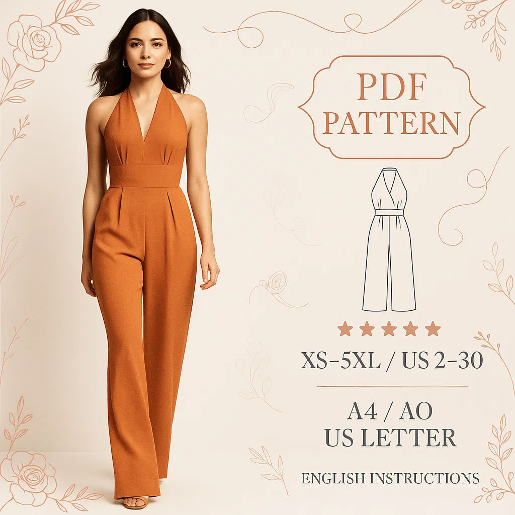 🔶 Orange Halter Neck Jumpsuit Sewing Pattern – XS to 5XL